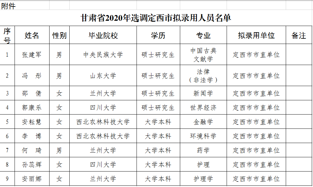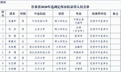 附件:甘肃省2020年选调定西市拟录用人员名单